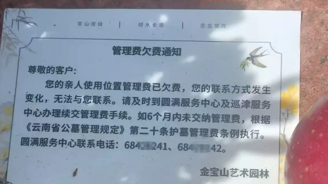 清明期间,云南一网友称上坟时发现墓碑被贴欠费通知单,引发关注。涉事昆明金宝山艺术园林回应称系管理费欠缴后联系不上家属才张贴提示,费用可补缴。当地规定显示,长期欠费或被认定为无主墓处理。